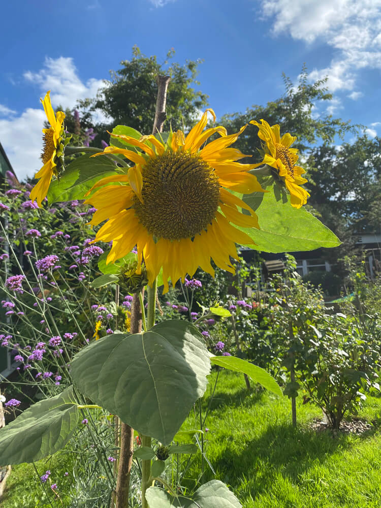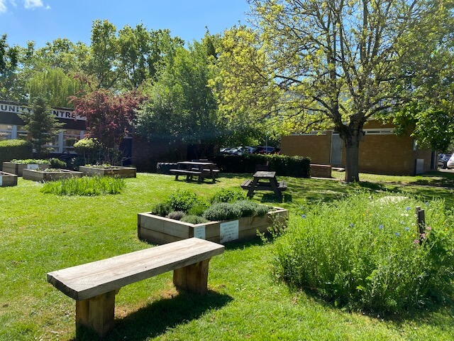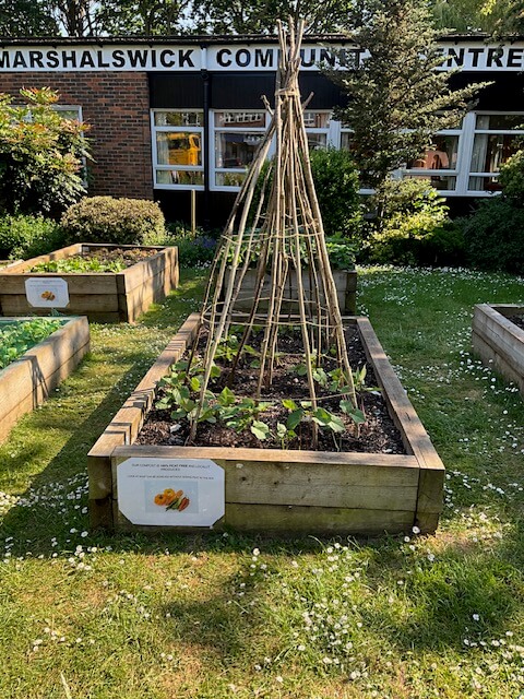 We have a thriving community garden located outside of Marshalswick Community Centre, where volunteers grow an array of fruits, vegetables, and garden plants. The garden has grown year on year since 2018, and now boasts six raised beds, bee and butterfly friendly wildflower beds, a colourful summer rose bed and a winter interest bed. All these alongside six fruit bushes, a small pond, an insect hotel, an upcycled water trough turned planter and mature shrub beds that surround the space. We make our own compost, grow our own plants from seed and all the produce is free for anyone in the community to pick.