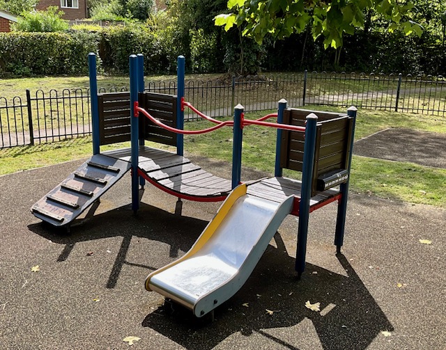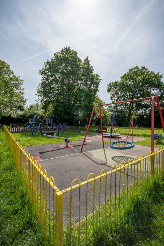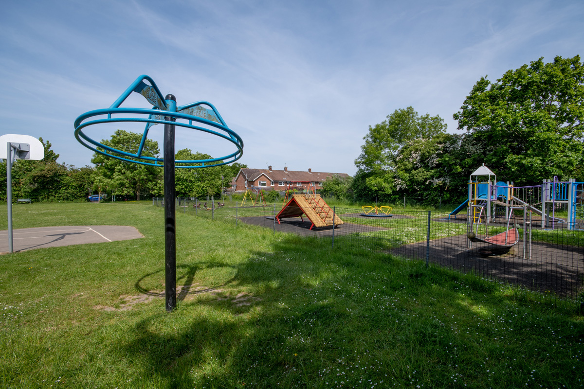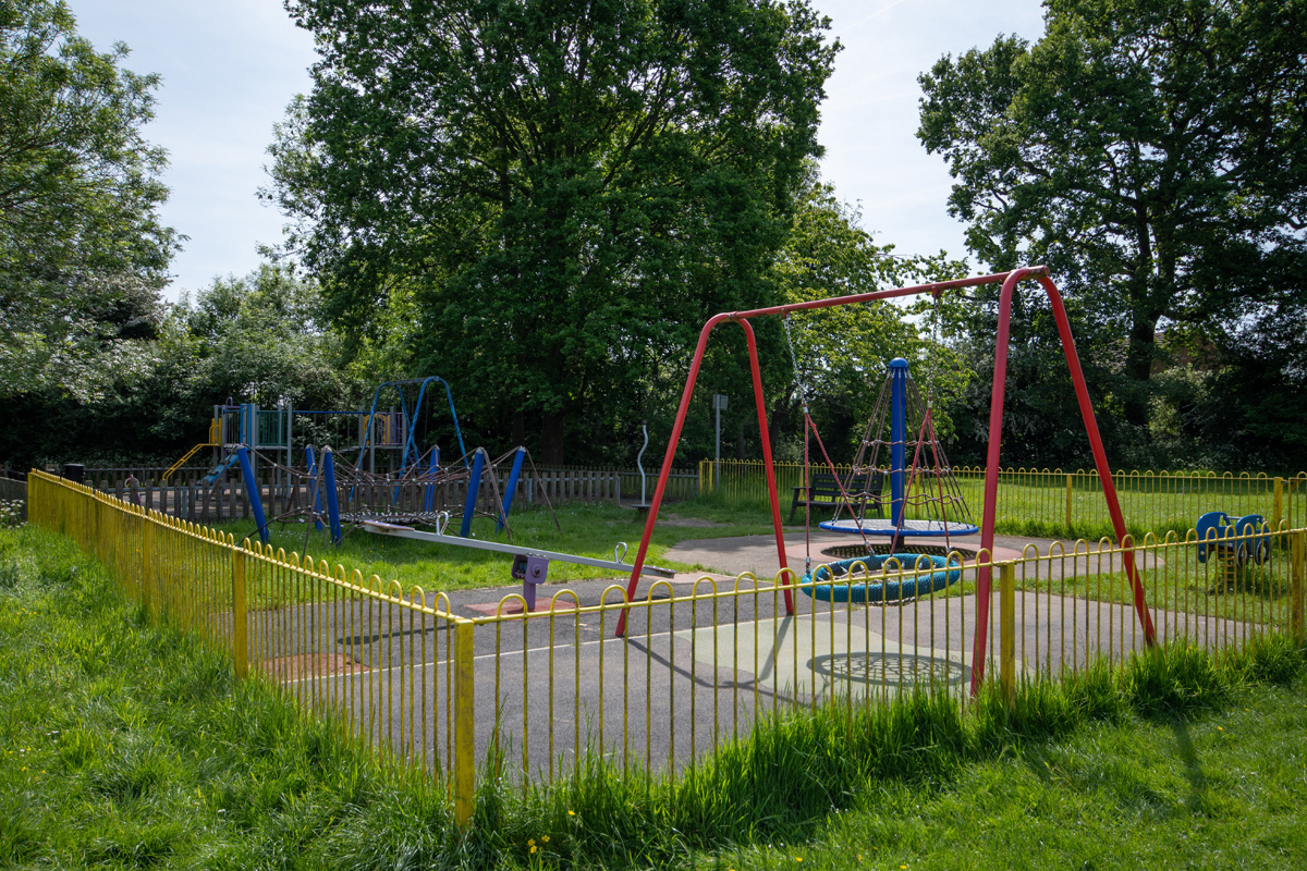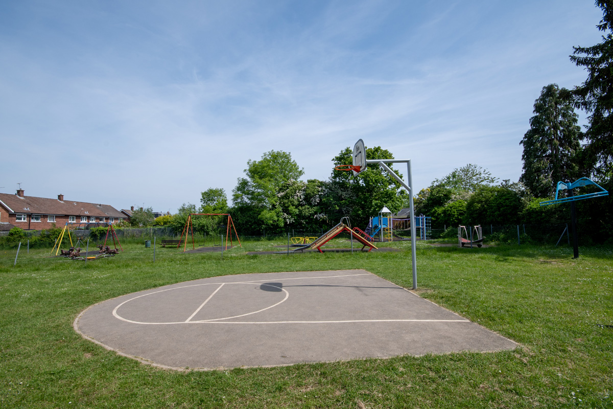 A fenced playground for children of all ages, enclosed within a larger area of open space. Outside of the playground is a basketball net and dribble area and an outdoor table tennis table. It can be accessed via a path from St Leonards Church, through the cemetery on House Lane or via a path from Lyndon Mead.