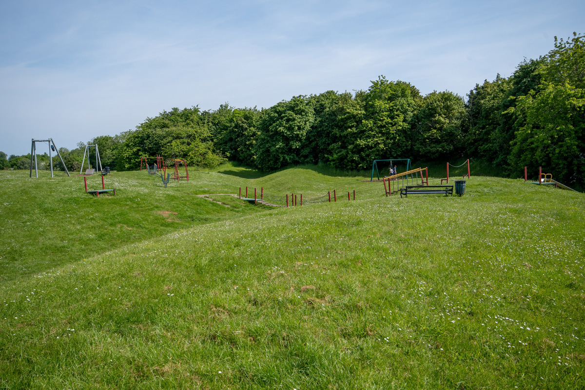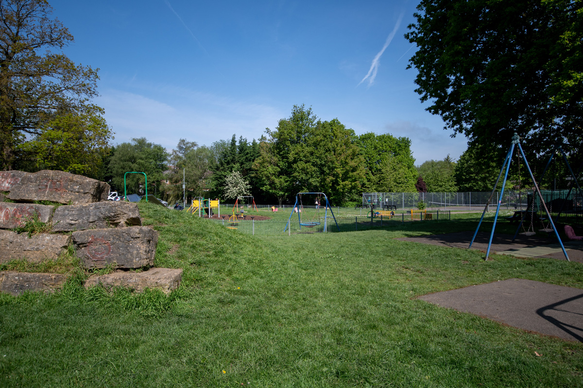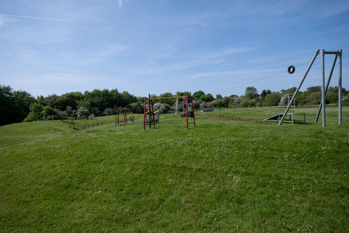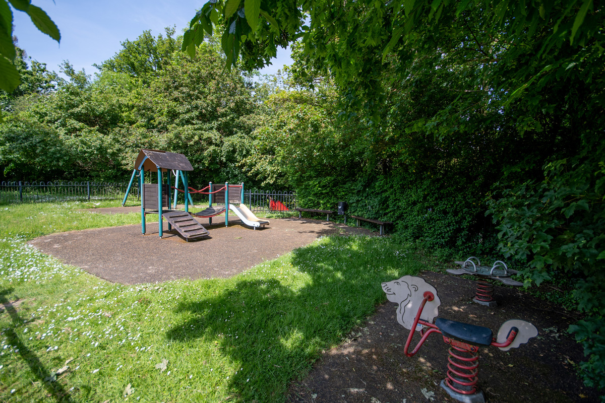 A fenced playground for children of all ages, enclosed within a larger area of open space. Outside of the playground is a basketball net and dribble area and an outdoor table tennis table. It can be accessed via a path from St Leonards Church, through the cemetery on House Lane or via a path from Lyndon Mead.